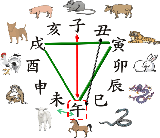 2026为丙午马年,值年太岁星君为文哲大将军,犯太岁的生肖主要有马、鼠、牛、兔这四个,其中属马之人本命年值太岁且刑太岁,属鼠之人冲太岁,属牛之人害太岁,属兔之人破太岁,如下图所示:
