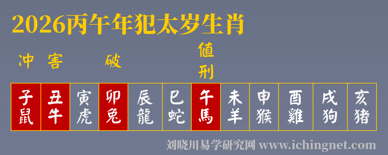 2026为丙午马年,值年太岁星君为文哲大将军,犯太岁的生肖主要有马、鼠、牛、兔这四个,其中属马之人本命年值太岁且刑太岁,属鼠之人冲太岁,属牛之人害太岁,属兔之人破太岁,如下图所示:
